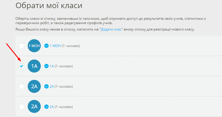 Якщо з класом вже працює інший учитель, ви можете обрати цей клас через меню «Мої класи», додати клас на свою сторінку, натиснувши «Обрати мої класи». Перед Вами — список класів Вашої школи, зареєстрованих на МійКлас. Вибрати класи, з якими Ви плануєте працювати і натисніть «Зберегти» внизу сторінки. Після того як Ви вибрали свої класи і зберегли зміни, Ви потрапите на сторінку «Мої класи». Зміст цієї сторінки дублює блок «Мої класи» на головній сторінці сайту.