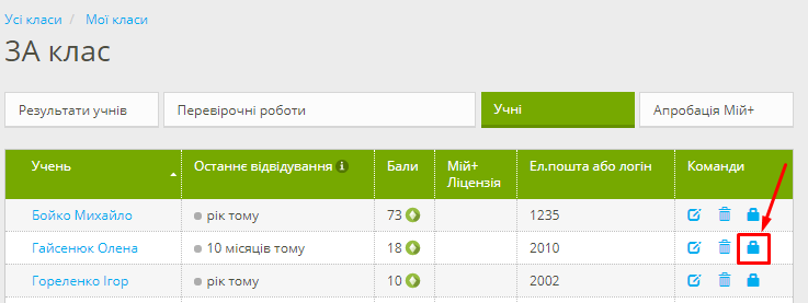 Ви, як учитель, можете змінити учневі пароль через меню «Мої класи» — обрати потрібний клас, вибрати «Учні». Навпроти учня, якому потрібно змінити пароль, натиснути кнопку змінити пароль у колонці «Команди». За потреби з цього вікна дитині можна нагадати логін або електронну адресу.