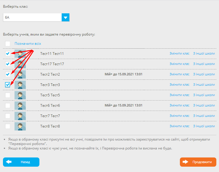Кожен учитель, який працює з підгрупою класу має можливість, при видачі перевірочної роботи, обрати тільки учнів своєї підгрупи.