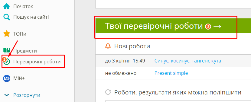 Після видачі перевірочної роботи вчителем, не залежно від способу реєстрації, у кожного учня на сторінці в меню «Перевірочні роботи», з’являється позначка про нові роботи і він може приступати до її виконання.