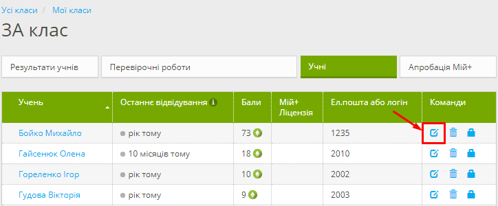 У вас, як у вчителя, є можливість редагувати профіль учня. Для цього потрібно перейти в розділ «Мої класи» — меню «Учні» (потрібного класу) — навпроти імені та прізвища дитини обрати у стовпчику команди кнопку «Редагувати» та відповідно внести корективи в дані учня.