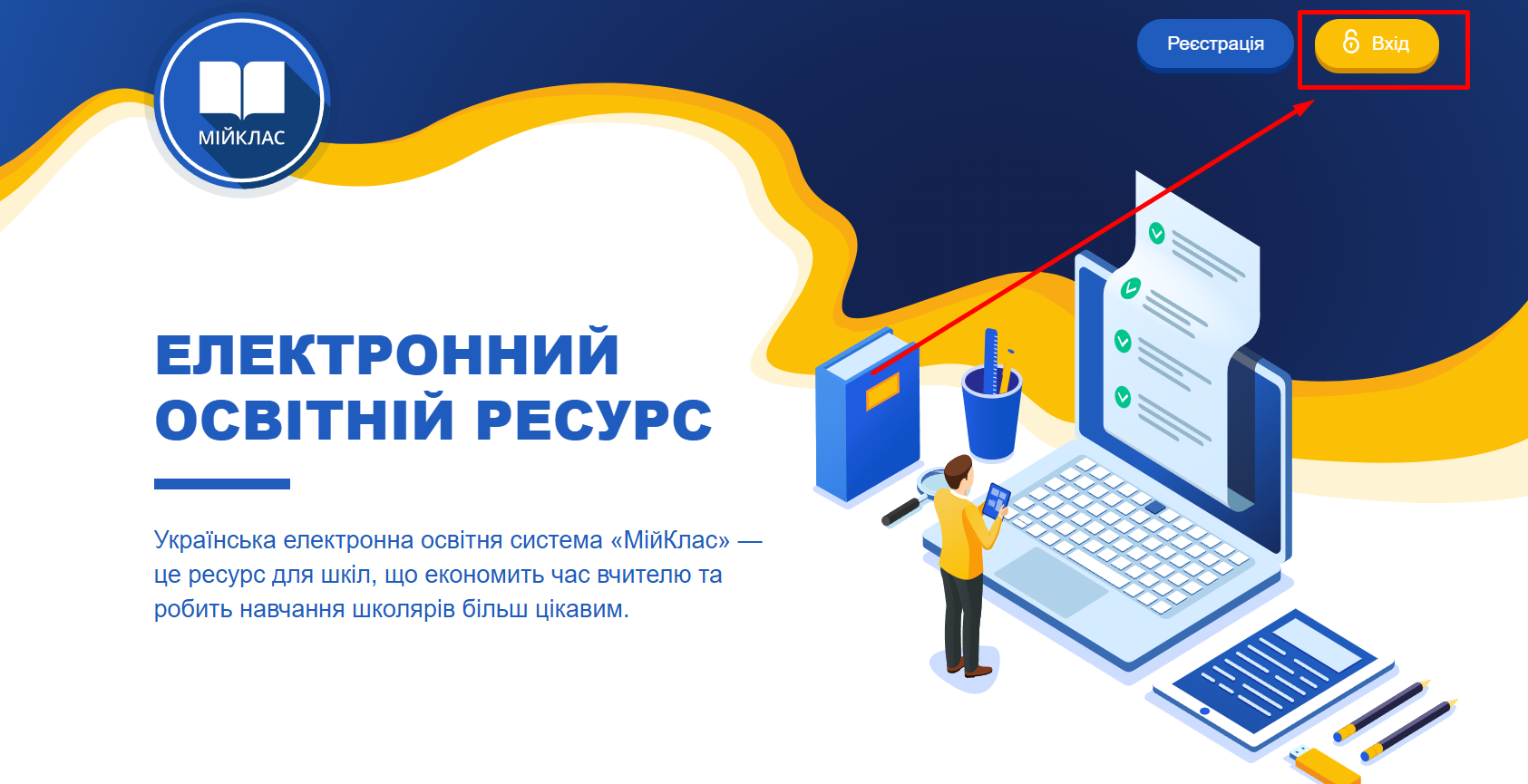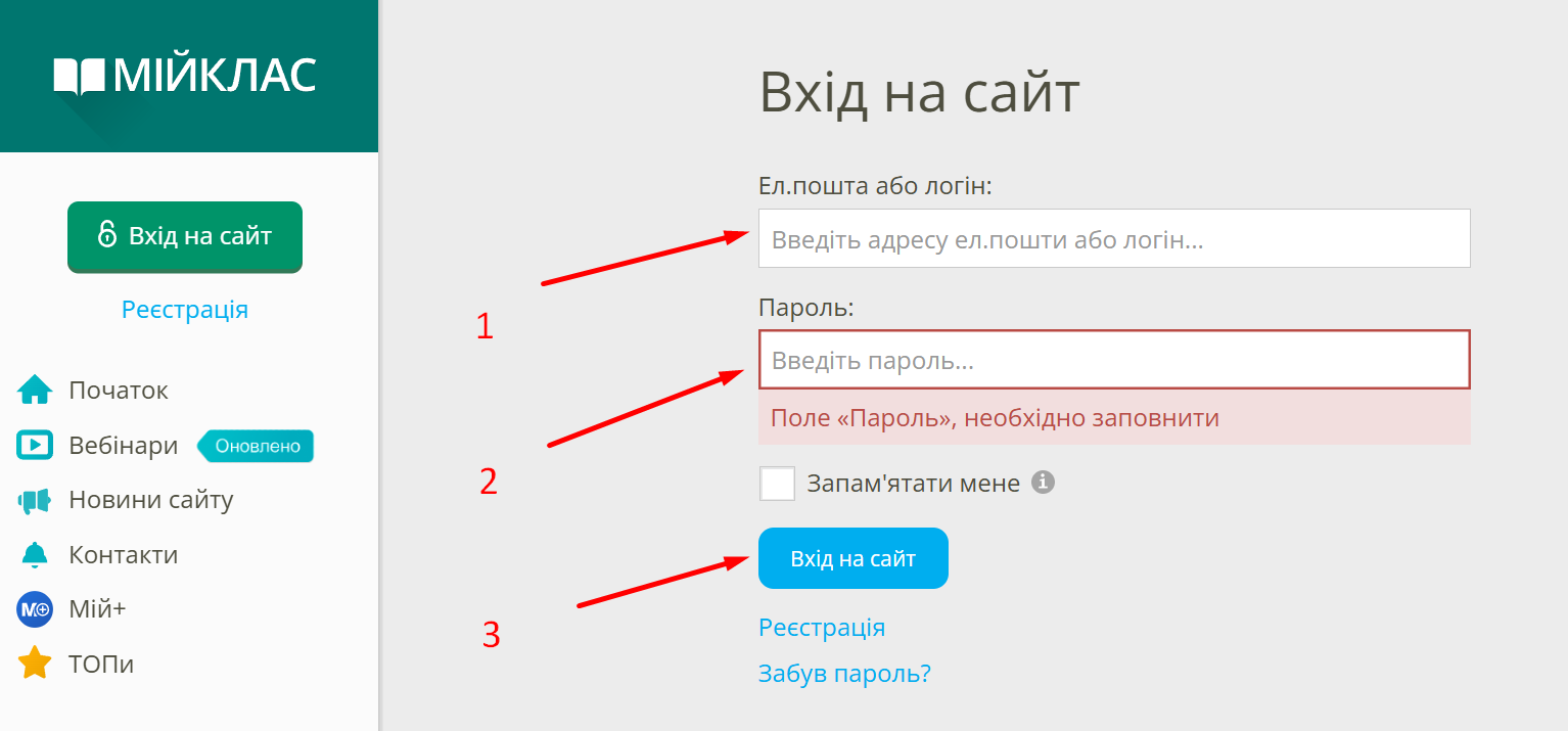Коли учні заходять на сайт www.miyklas.com.ua, то бачать зверху у правому куті дві кнопки «Реєстрація» і «Вхід». Потрібно натиснути «Вхід» та в наступному вікні ввести логін (1) і пароль (2), за яким їх зареєстрував учитель.