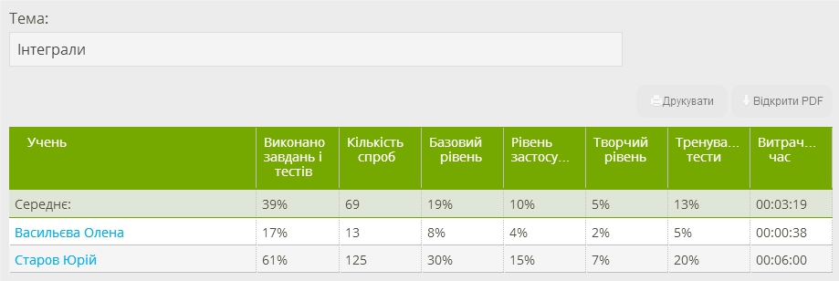 Статус вчителя дозволяє переглядати результати своїх учнів по кожній освоєній темі. Додатково ви отримаєте докладну статистику за виконаними кожним учнем завданням.