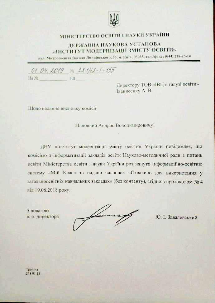 Ми раді повідомити, що наш сайт отримав гриф від Міністерства освіти і науки України (№22.1/12-Г- 155 від 01.04.2019), який офіційно дозволяє використовувати ЕОР «МiйКлас» в загальноосвітніх навчальних закладах.