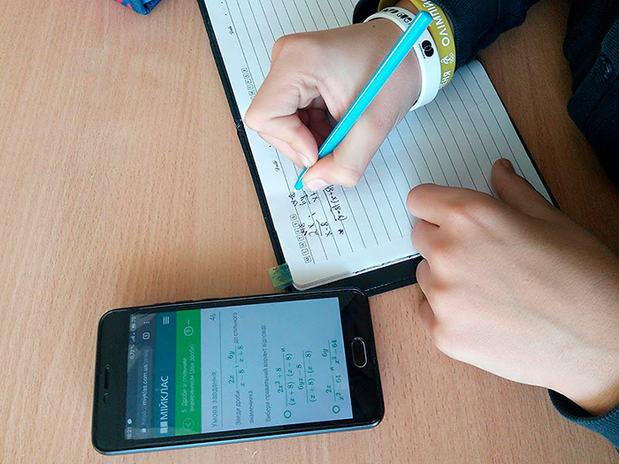 Розв’язуємо вправи самостійно, кожен використовує свій акаунт у МійКлас та записує розв’язання в зошит. При цьому, частина учнів працює зі смартфонами, а частина – за комп’ютерами (у кого немає смартфона). В школі є вільний доступ до Інтернету, отже з роботою ресурсу не виникає проблем.