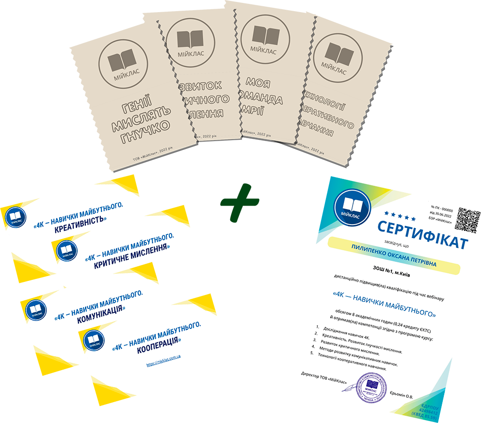 Усі охочі зможуть отримати Сертифікат про підвищення кваліфікації (2 години/0,06 кредиту ЄКТС або 8 годин/0,24 кредиту ЄКТС) та додаткові наочні матеріали, розроблені командою МійКлас за умови сплати організаційного внеску.