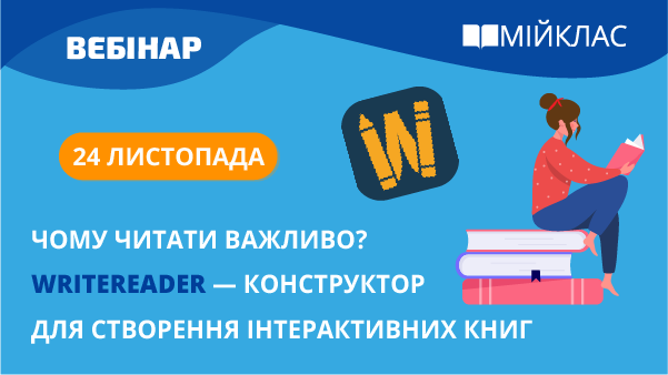 24 листопада о 18.00 запрошуємо педагогічних та науково-педагогічних працівників закладів загальної середньої освіти, психологів, вихователів та батьків відвідати вебінар «Чому читати важливо? WriteReader — конструктор для створення інтерактивних книг».