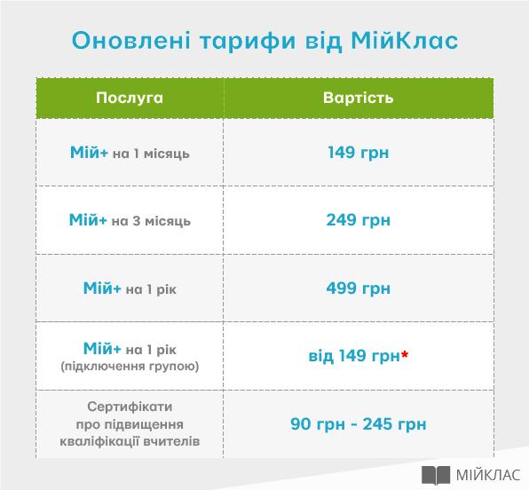 Вітаємо Вас із наближенням навчального року та дякуємо, що залишаєтеся з нами. Повідомляємо Вам, що у новому навчальному році будуть діяти оновлені тарифи на послуги від МійКлас: