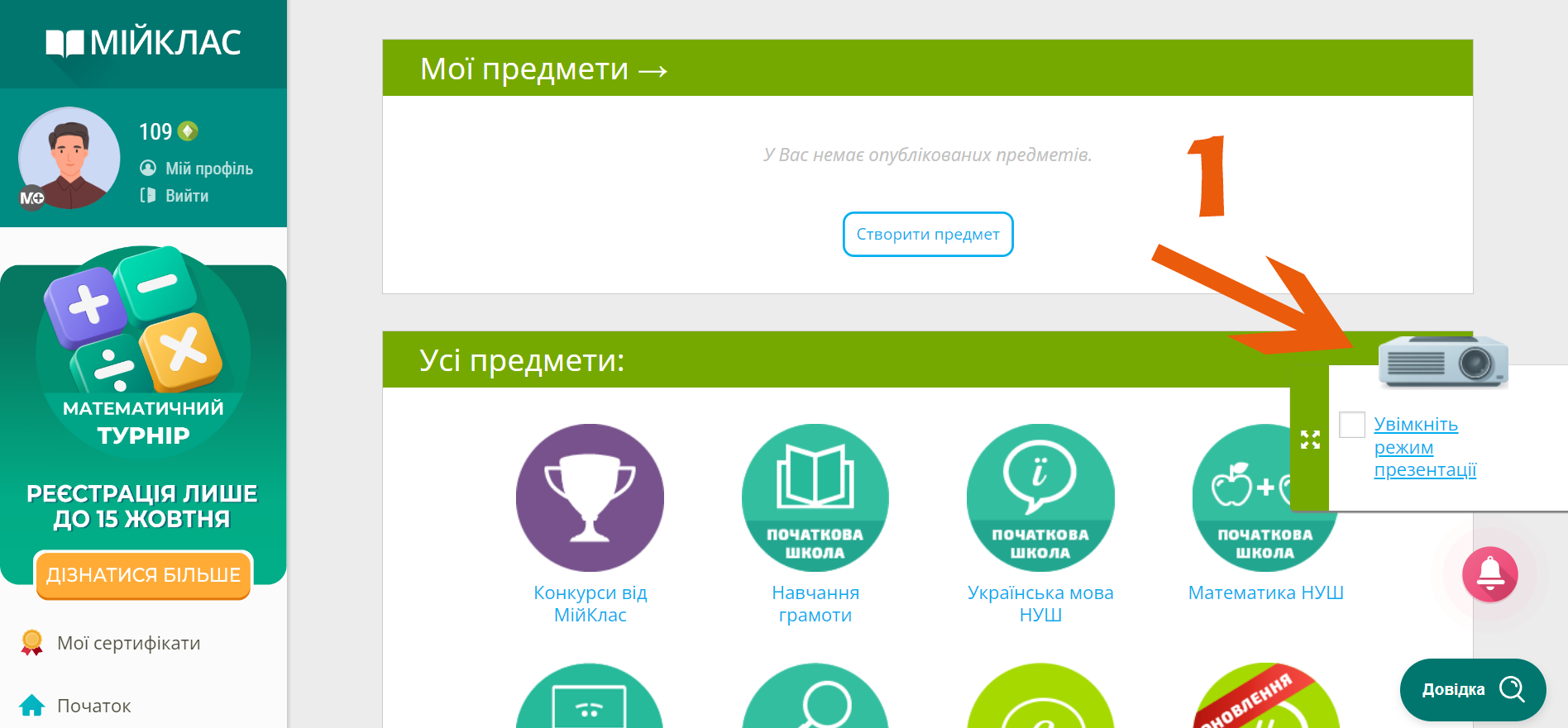 На пристрої, підключеному до проектора, перейдіть на сторінку сайту «МійКлас» (miyklas.com.ua), увійдіть до свого профіля за допомогою логіна й пароля. У меню (зліва) виберіть команду «Предмети» . На сторінці, що відкриється, натисніть справа кнопку ① та встановіть прапорець навпроти пункту «Увімкніть режим презентації».