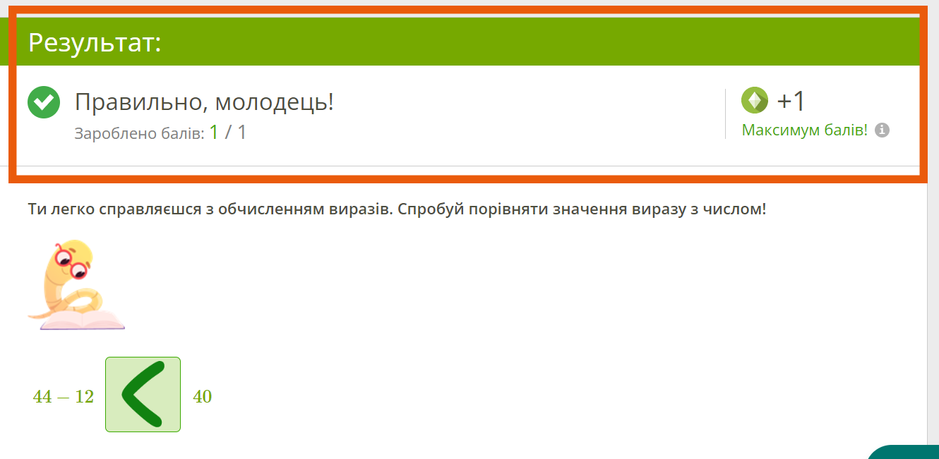 Якщо учень правильно розв’язав завдання, то на екрані буде виведено відповідне повідомлення і кількість зароблених балів у вікні «Результат».