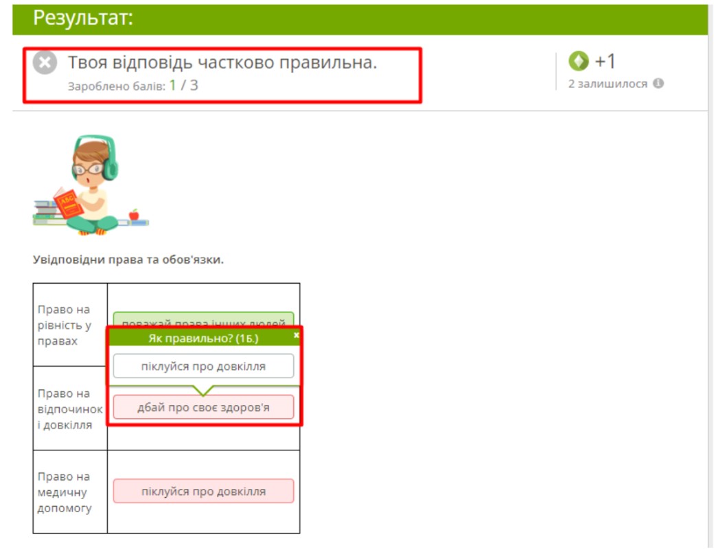 Якщо завдання виконано неправильно, то повідомлення про те, що воно не зараховано, та пропозиція спробувати ще. При цьому учень може дізнатися правильну відповідь, натиснувши на червоний прямокутник навколо неправильної відповіді. Після цього з’явиться віконце «Як правильно?» (за умови активованої послуги Мій+).
