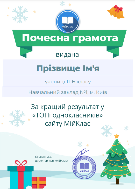 Відкрийте шаблон грамоти у браузері, введіть ім’я та клас учня, клацнувши у відповідній області. Завантажте диплом у форматі PDF “Зі змінами” і надішліть дітям класу зручним месенджером. Або збережіть варіант шаблону як зображення, роздрукуйте та запишіть необхідні дані від руки.