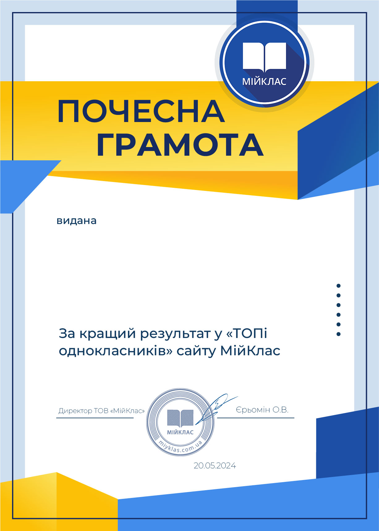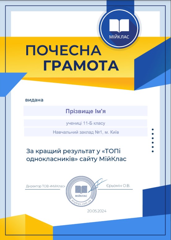 Відкрийте шаблон грамоти у браузері, введіть ім’я та клас учня, клацнувши у відповідній області. Завантажте диплом у форматі PDF “Зі змінами” і надішліть дітям класу зручним месенджером. Або збережіть варіант шаблону як зображення, роздрукуйте та запишіть необхідні дані від руки.
