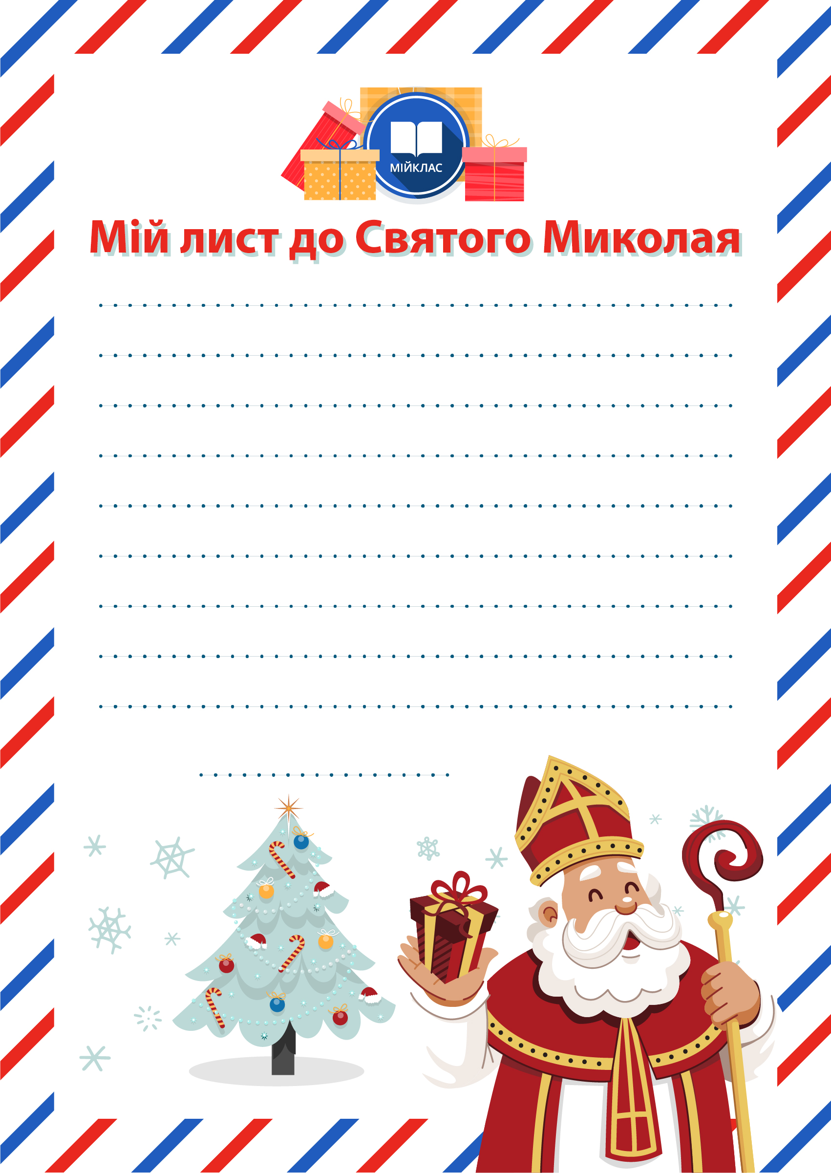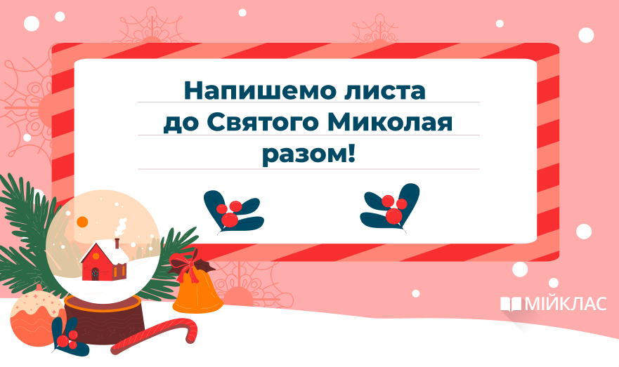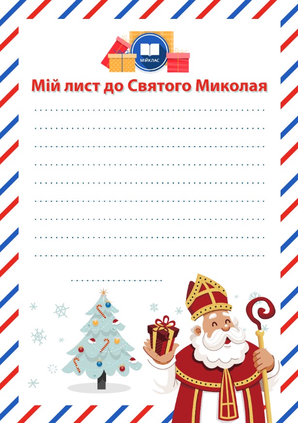 Вже цієї п’ятниці, 6 грудня, кожна чемна дитина знайде гостинець від Святого Миколая у себе під подушкою. Допоможіть Чудотворцю зрозуміти, чи заслужили Ви на подарунок цьогоріч, а також підкажіть йому свої уподобання та бажання. Команда МійКлас підготувала для Вас шаблон для написання листа Миколаю, щоб допомогти створити святкову атмосферу.