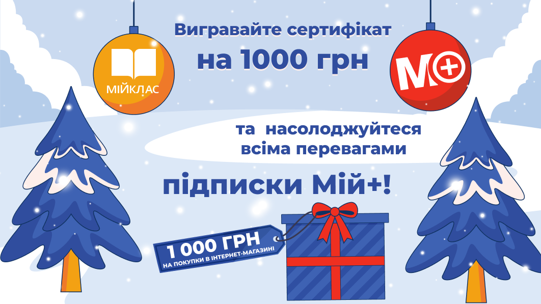 Свята — це час подарунків та нових можливостей! Платформа МійКлас дарує вам чудовий шанс виграти сертифікат на 1000 грн в інтернет-магазині Rozetka, 5 наборів фірмового мерчу від МійКлас (рюкзак для змінного взуття, чашка, набір канцелярії) та скористатись вигідною пропозицією на підписку Мій+.