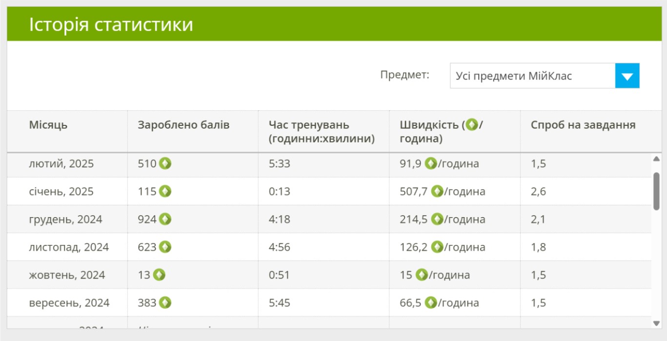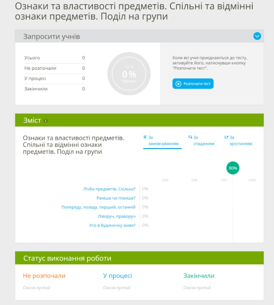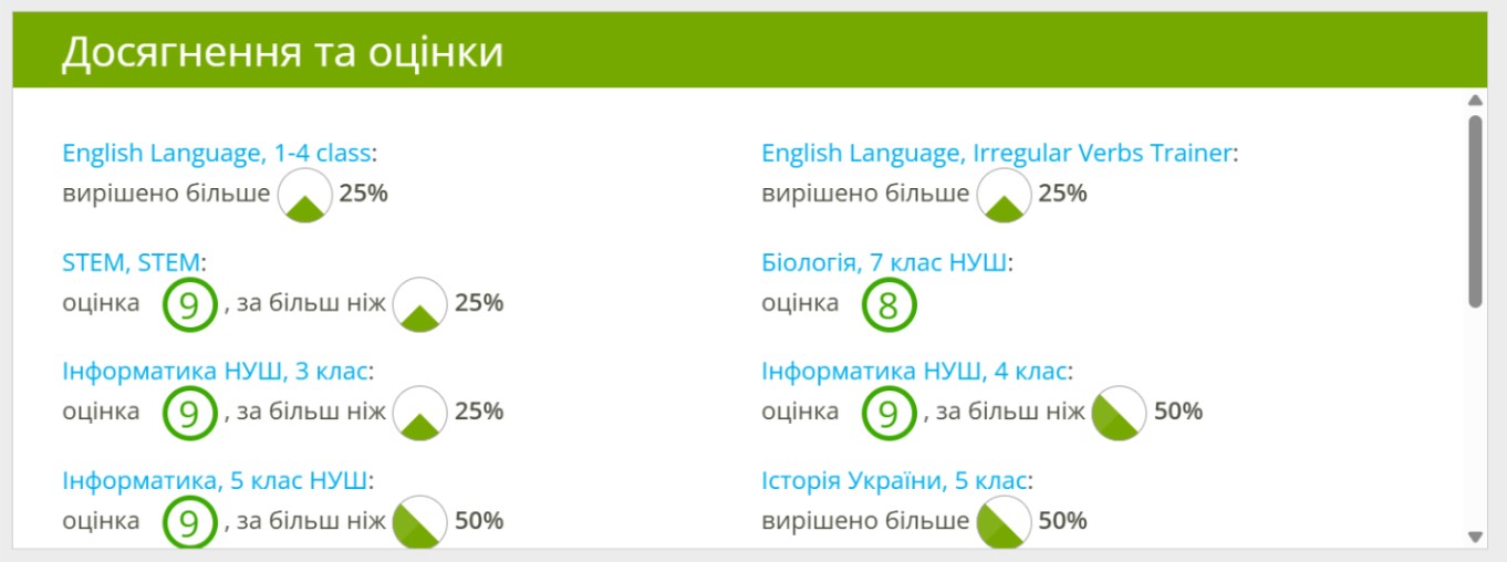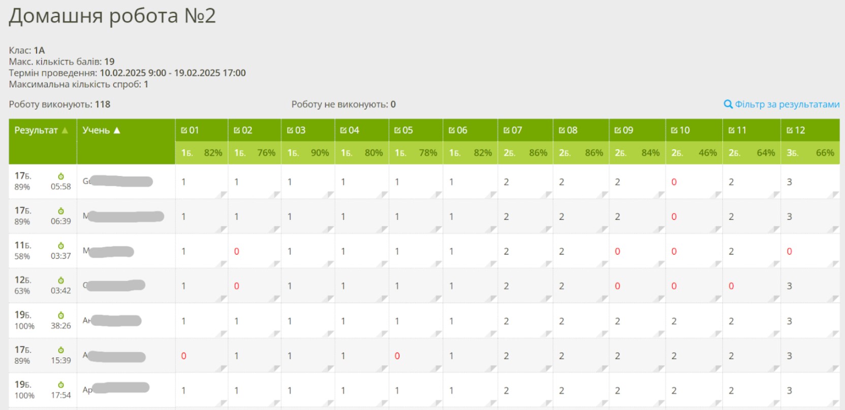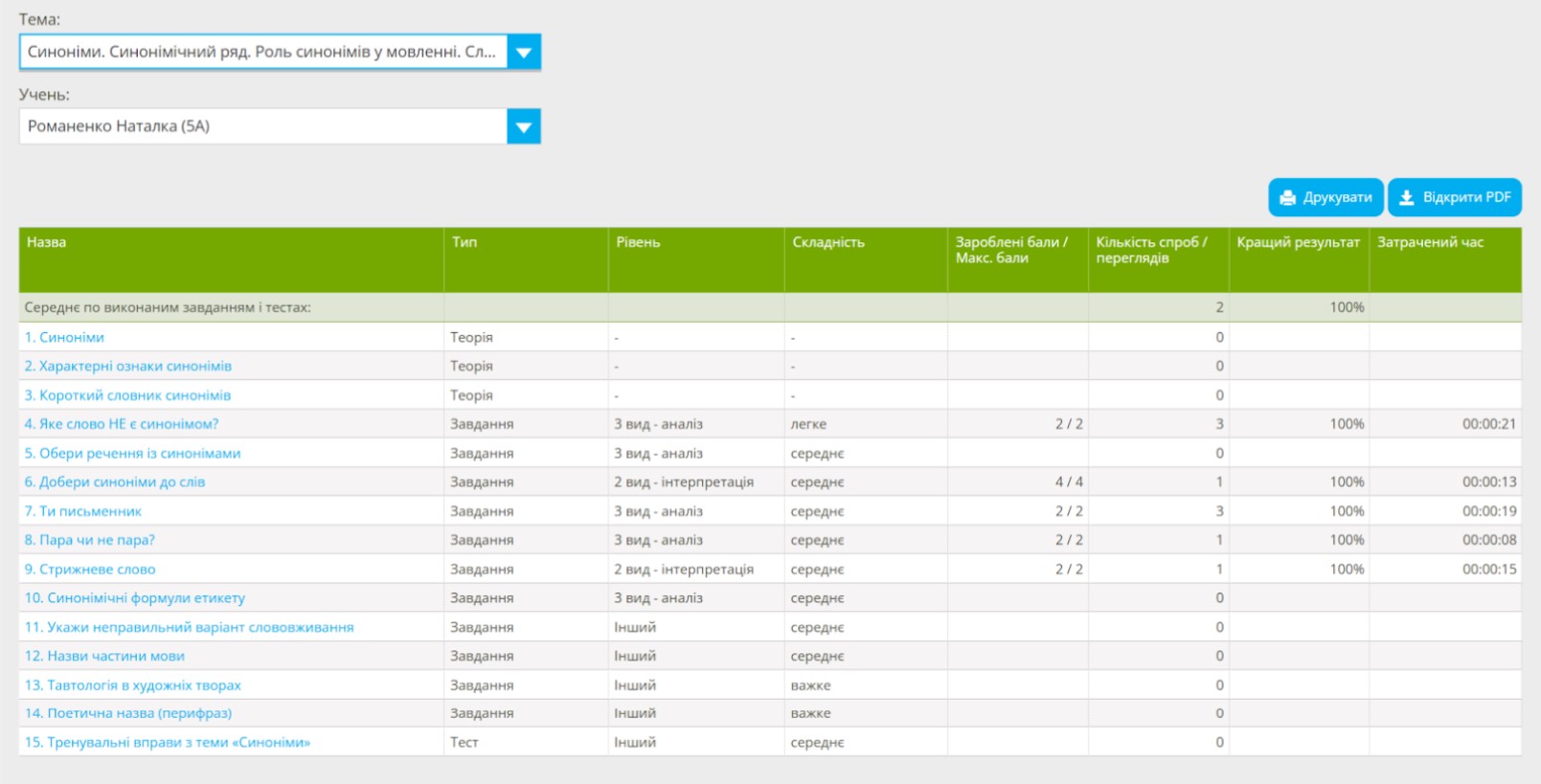 - Детальному аналізу навчальних досягнень у розділі «Результати учнів» можна переглядати статистику успішності кожного учня за темами та завданнями, а також здійснювати зручний контроль та корекцію процесу навчання.