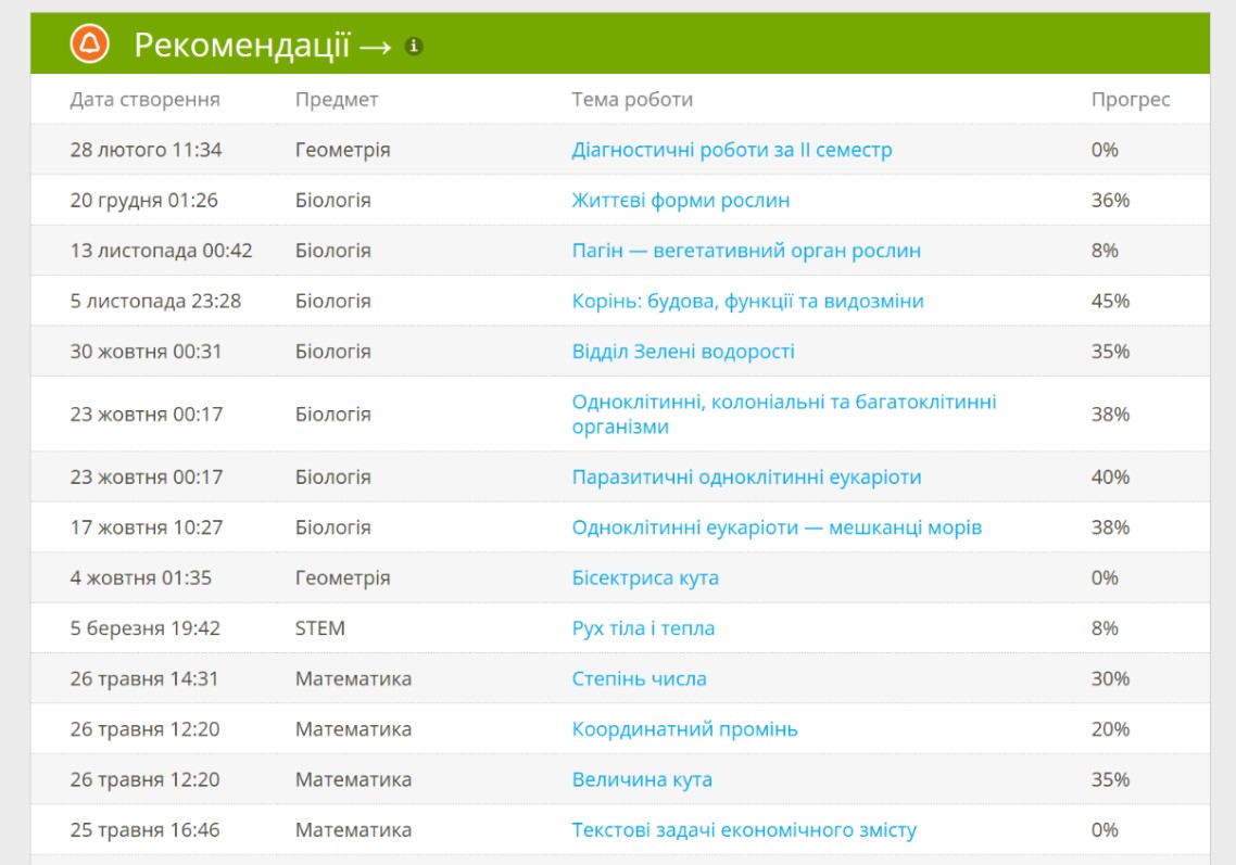 Завдяки автоматизованому аналізу успішності платформа МійКлас створює індивідуальні рекомендації за результатами виконаних учнем тестових робіт. Персоналізовані плани навчання дають можливість зосередитися на тих темах, які потребують додаткового опрацювання.
